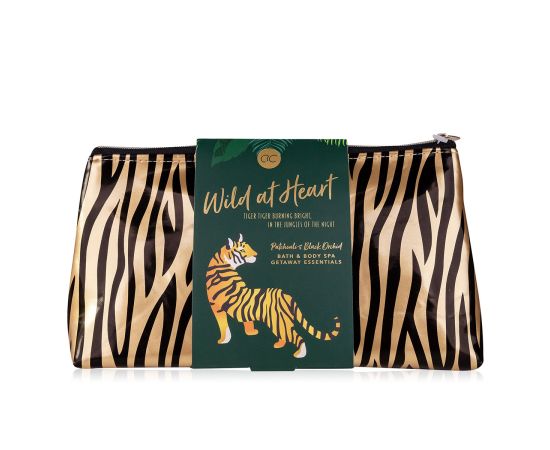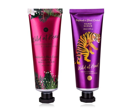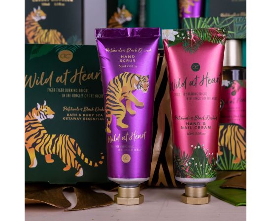 Pokloni za žene, krema za ruke, piling za tijelo, Hand care set WILD AT HEART in cosmetic bag, 60ml hand & nail cream, 60ml hand piling za tijelo, fragrance: Patchouli & Black Orchid, col. green/gold/black, pokloni za božić