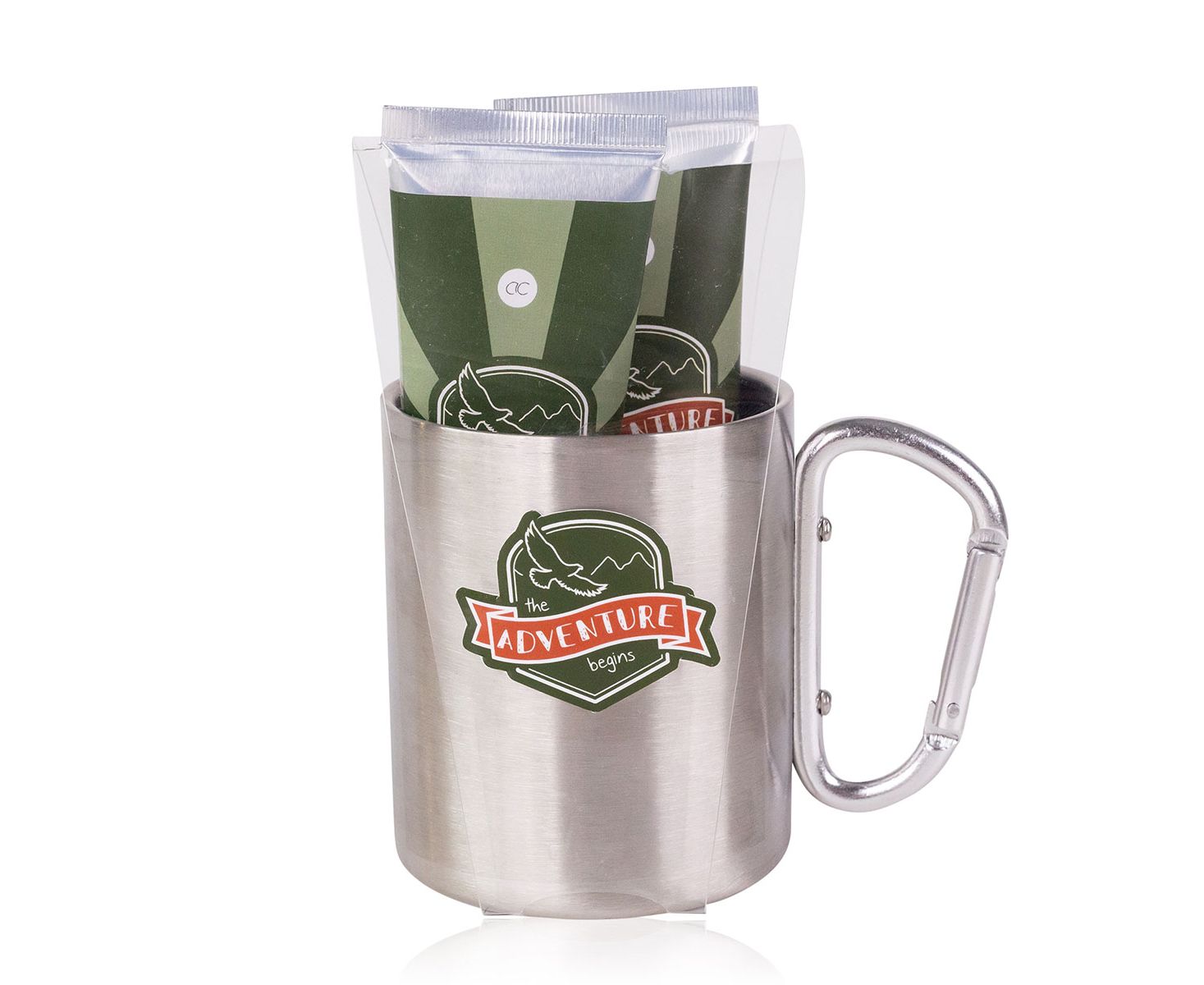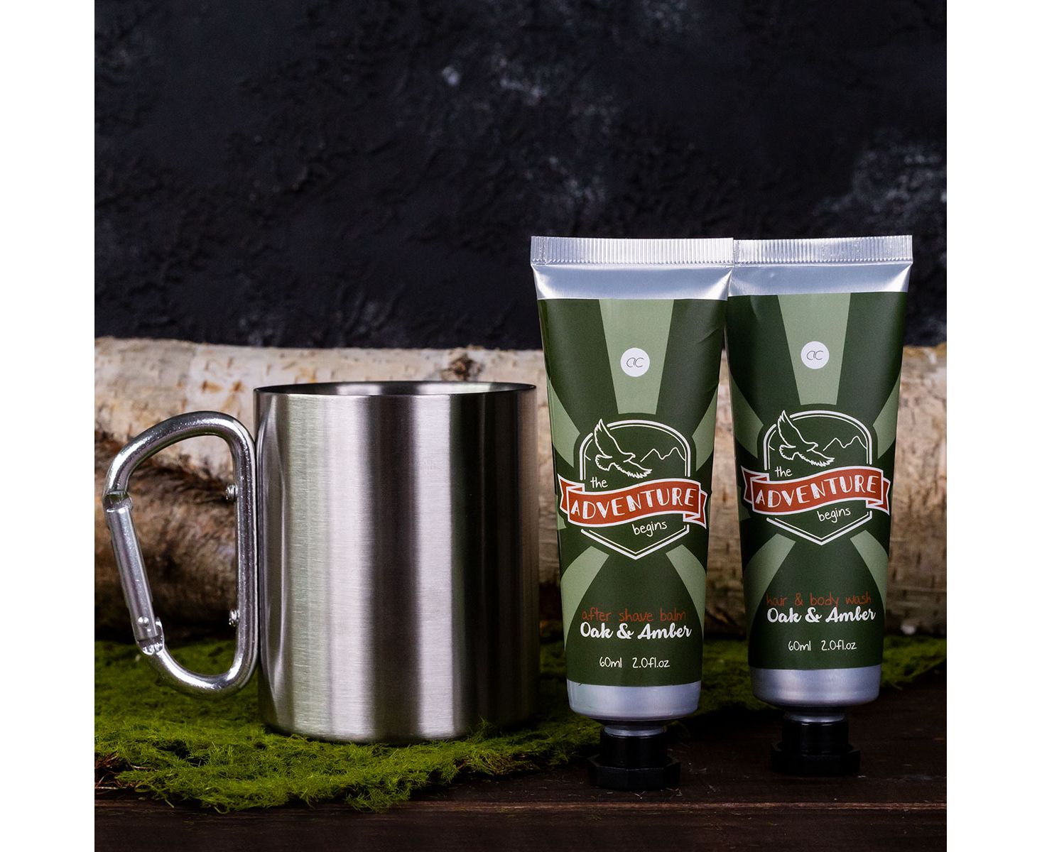 Pokloni za muškarce, gel za tuširanje, metalna šalica, balzam nakon brijanja, Bath set ADVENTURE COLLECTION in stainless-steel mug (350ml) with carabiner handle, 60ml hair & body wash, 60ml balzam nakon brijanja balm, fragrance: Oak & Amber, col. green/orange, pokloni za božić
