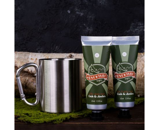 Pokloni za muškarce, gel za tuširanje, metalna šalica, balzam nakon brijanja, Bath set ADVENTURE COLLECTION in stainless-steel mug (350ml) with carabiner handle, 60ml hair & body wash, 60ml balzam nakon brijanja balm, fragrance: Oak & Amber, col. green/or